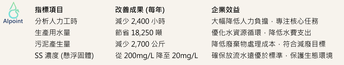 成效:降低人力判斷、投藥成本降低約30%、產水率提升20%、節電效果達40%